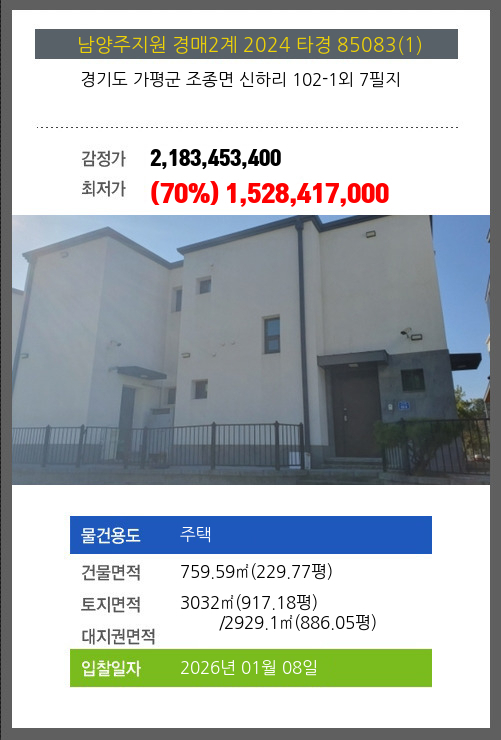 사건번호 2024 타경 85083(1) 본건은 경기도 가평군 조종면 신하리 102-1외 7필지소재하는 주택경매 물건의 포스팅입니다. 건물면적 [ 759.59㎡ (229.77평) ]토지면적 [ 전체:3032㎡ (917.18평) 매각지분:2929.1㎡ (886.05평) ]