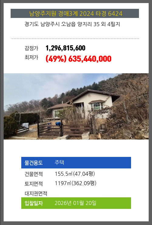 사건번호 2024 타경 6424 본건은 경기도 남양주시 오남읍 양지리 35 외 4필지소재하는 주택경매 물건의 포스팅입니다. 건물면적 [ 155.5㎡ (47.04평) ]토지면적 [ 1197㎡ (362.09평) ] 시세를