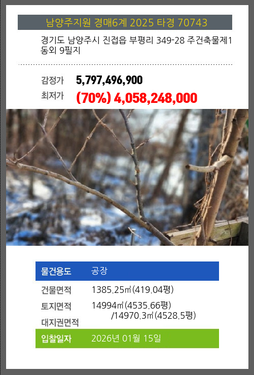 사건번호 2025 타경 70743 본건은 경기도 남양주시 진접읍 부평리 349-28 주건축물제1동외 9필지소재하는 공장경매 물건의 포스팅입니다. 건물면적 [ 1385.25㎡ (419.04평) ]토지면적 [ 전체:14994㎡ (4535.66평) 매각지분:14970.3㎡ (4528.5평)