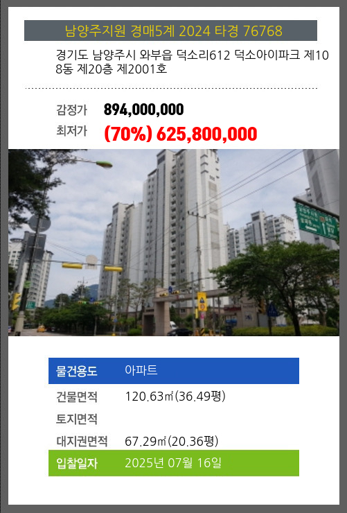 사건번호 2024 타경 76768 본건은 경기도 남양주시 와부읍 덕소리612 덕소아이파크 제108동 제20층 제2001호소재하는 아파트경매 물건의 포스팅입니다. 건물면적 [ 120.63㎡ (36.49평) ]대지권 [ 67.29㎡ (20.36평) ]