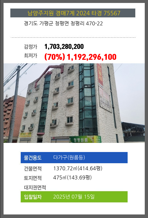 사건번호 2024 타경 75567 본건은 경기도 가평군 청평면 청평리 470-22소재하는 다가구(원룸등)경매 물건의 포스팅입니다. 건물면적 [ 1370.72㎡ (414.64평) ]토지면적 [ 475㎡ (143.69평) ] 시세를 반영한 감정가