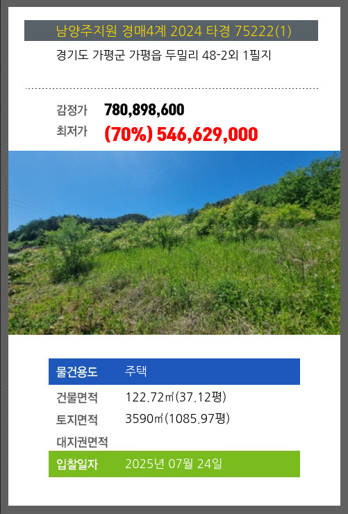 사건번호 2024 타경 75222(1) 본건은 경기도 가평군 가평읍 두밀리 48-2외 1필지소재하는 주택경매 물건의 포스팅입니다. 건물면적 [ 122.72㎡ (37.12평) ]토지면적 [ 3590㎡ (1085.97평) ] 시세를 반영한