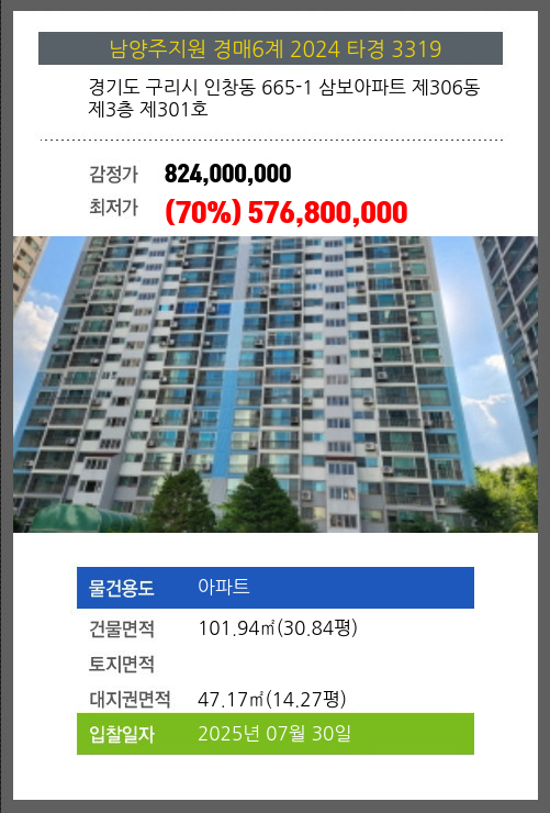 사건번호 2024 타경 3319 본건은 경기도 구리시 인창동 665-1 삼보아파트 제306동 제3층 제301호소재하는 아파트경매 물건의 포스팅입니다. 건물면적 [ 101.94㎡ (30.84평) ]대지권 [ 47.17㎡ (14.27평) ]