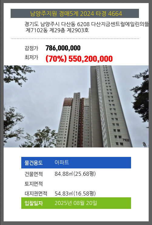 사건번호 2024 타경 4664 본건은 경기도 남양주시 다산동 6208 다산지금센트럴에일린의뜰 제7102동 제29층 제2903호소재하는 아파트경매 물건의 포스팅입니다. 건물면적 [ 84.88㎡ (25.68평) ]대지권 [ 54.83㎡ (16.58평) ]