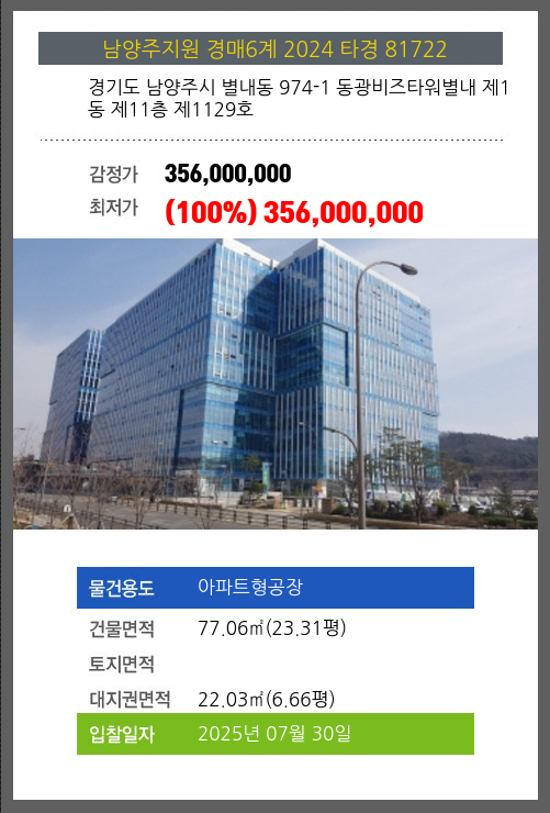 사건번호 2024 타경 81722 본건은 경기도 남양주시 별내동 974-1 동광비즈타워별내 제1동 제11층 제1129호소재하는 아파트형공장경매 물건의 포스팅입니다. 건물면적 [ 77.06㎡ (23.31평) ]대지권 [ 22.03㎡ (6.66평) ]