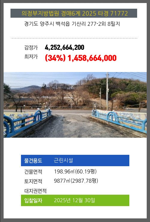 사건번호 2025 타경 71772 본건은 경기도 양주시 백석읍 기산리 277-2외 8필지소재하는 근린시설경매 물건의 포스팅입니다. 건물면적 [ 198.96㎡ (60.19평) ]토지면적 [ 9877㎡ (2987.78평) ] 시세를 반영한