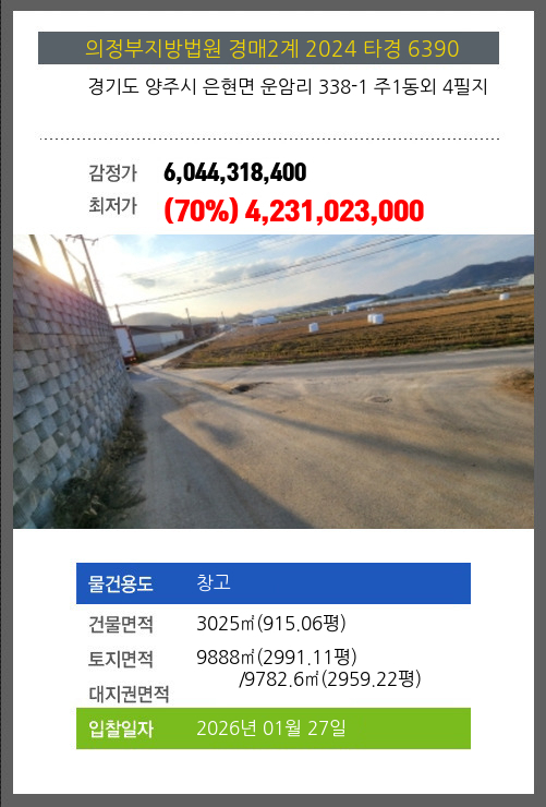 사건번호 2024 타경 6390 본건은 경기도 양주시 은현면 운암리 338-1 주1동외 4필지소재하는 창고경매 물건의 포스팅입니다. 건물면적 [ 3025㎡ (915.06평) ]토지면적 [ 전체:9888㎡ (2991.11평) 매각지분:9782.6㎡ (2959.22평)