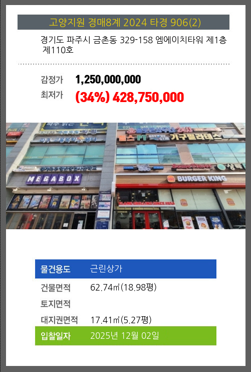 사건번호 2024 타경 906(2) 본건은 경기도 파주시 금촌동 329-158 엠에이치타워 제1층 제110호소재하는 근린상가경매 물건의 포스팅입니다. 건물면적 [ 62.74㎡ (18.98평) ]대지권 [ 17.41㎡ (5.27평) ] 시세를