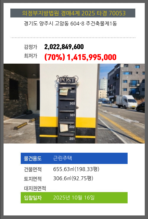 사건번호 2025 타경 70053 본건은 경기도 양주시 고암동 604-8 주건축물제1동소재하는 근린주택경매 물건의 포스팅입니다. 건물면적 [ 655.63㎡ (198.33평) ]토지면적 [ 306.6㎡ (92.75평) ] 시세를 반영한 감정가