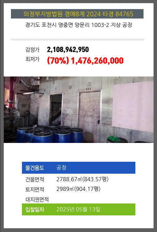 사건번호 2024 타경 84765 본건은 경기도 포천시 영중면 양문리 1003-2 지상 공장소재하는 공장경매 물건의 포스팅입니다. 건물면적 [ 2788.67㎡ (843.57평) ]토지면적 [ 2989㎡ (904.17평) ] 시세를
