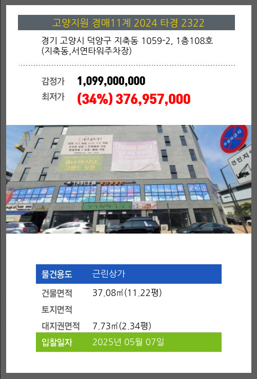 사건번호 2024 타경 2322 본건은 경기 고양시 덕양구 지축동 1059-2, 1층108호 (지축동,서연타워주차장)소재하는 근린상가경매 물건의 포스팅입니다. 건물면적 [ 37.08㎡ (11.22평) ]대지권 [ 7.73㎡ (2.34평) ] 시세를