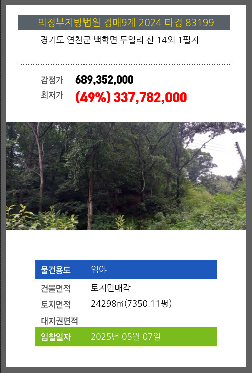 사건번호 2024 타경 83199 본건은 경기도 연천군 백학면 두일리 산 14외 1필지소재하는 임야경매 물건의 포스팅입니다. 건물면적 [ 토지만매각 ]토지면적 [ 24298㎡ (7350.11평) ] 시세를 반영한