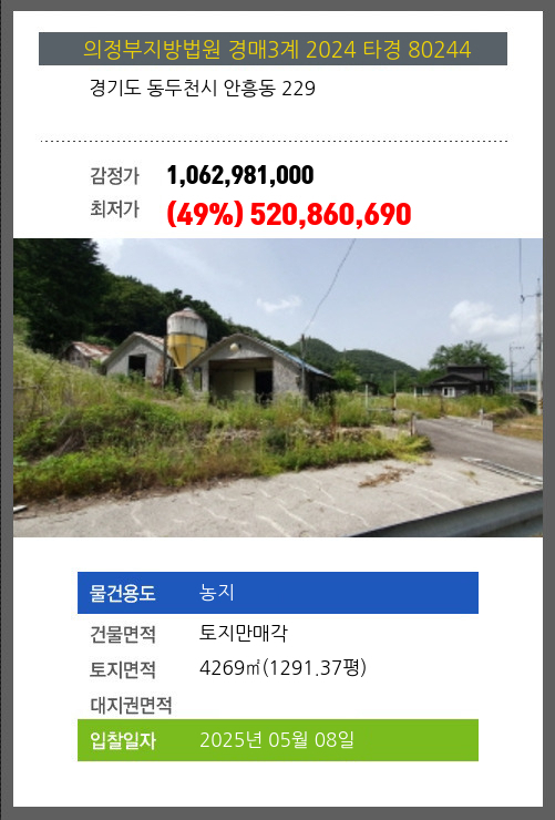 사건번호 2024 타경 80244 본건은 경기도 동두천시 안흥동 229소재하는 농지경매 물건의 포스팅입니다. 건물면적 [ 토지만매각 ]토지면적 [ 4269㎡ (1291.37평) ] 시세를 반영한 감정가 1,062,981,000에서2회 유찰되어