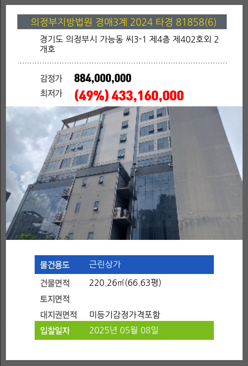 사건번호 2024 타경 81858(6) 본건은 경기도 의정부시 가능동 씨3-1 제4층 제402호외 2개호소재하는 근린상가경매 물건의 포스팅입니다. 건물면적 [ 220.26㎡ (66.63평) ]대지권 [ 미등기감정가격포함 ] 시세를 반영한