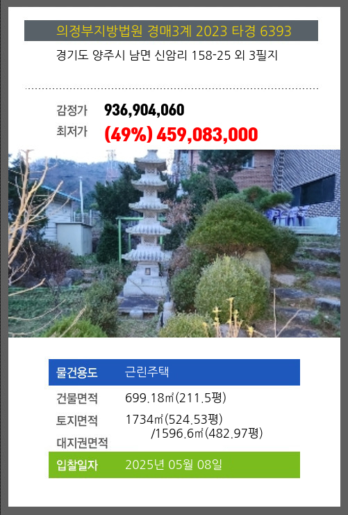 사건번호 2023 타경 6393 본건은 경기도 양주시 남면 신암리 158-25 외 3필지소재하는 근린주택경매 물건의 포스팅입니다. 건물면적 [ 699.18㎡ (211.5평) ]토지면적 [ 전체:1734㎡ (524.53평) 매각지분:1596.6㎡ (482.97평)