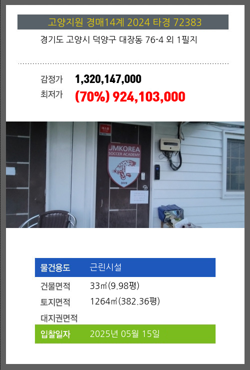 사건번호 2024 타경 72383 본건은 경기도 고양시 덕양구 대장동 76-4 외 1필지소재하는 근린시설경매 물건의 포스팅입니다. 건물면적 [ 33㎡ (9.98평) ]토지면적 [ 1264㎡ (382.36평) ] 시세를