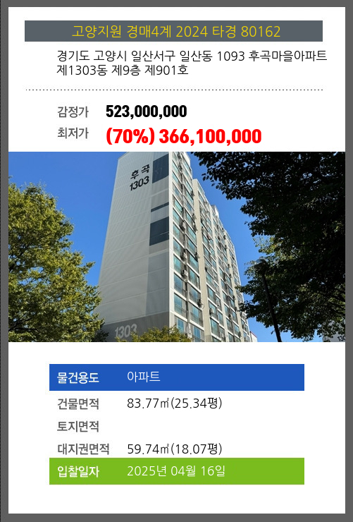 사건번호 2024 타경 80162 본건은 경기도 고양시 일산서구 일산동 1093 후곡마을아파트 제1303동 제9층 제901호소재하는 아파트경매 물건의 포스팅입니다. 건물면적 [ 83.77㎡ (25.34평) ]대지권 [ 59.74㎡ (18.07평)