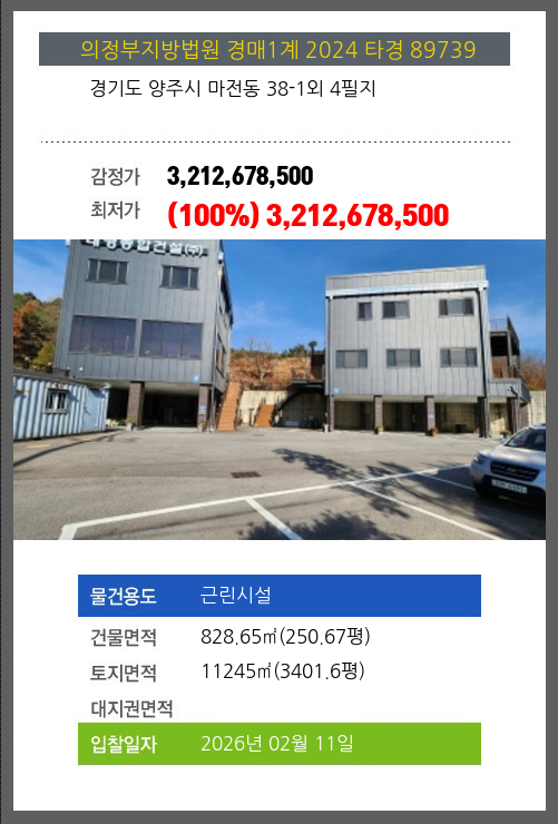 사건번호 2024 타경 89739 본건은 경기도 양주시 마전동 38-1외 4필지소재하는 근린시설경매 물건의 포스팅입니다. 건물면적 [ 828.65㎡ (250.67평) ]토지면적 [ 11245㎡ (3401.6평) ] 시세를 반영한 감정가