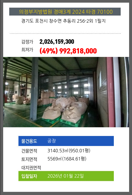 사건번호 2024 타경 70100 본건은 경기도 포천시 창수면 추동리 256-2외 1필지소재하는 공장경매 물건의 포스팅입니다. 건물면적 [ 3140.53㎡ (950.01평) ]토지면적 [ 5569㎡ (1684.61평) ] 시세를 반영한