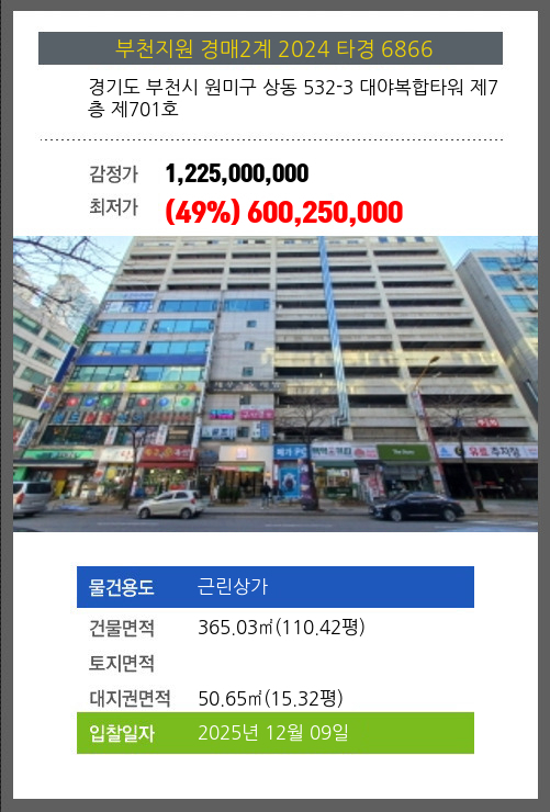 사건번호 2024 타경 6866 본건은 경기도 부천시 원미구 상동 532-3 대야복합타워 제7층 제701호소재하는 근린상가경매 물건의 포스팅입니다. 건물면적 [ 365.03㎡ (110.42평) ]대지권 [ 50.65㎡ (15.32평) ]