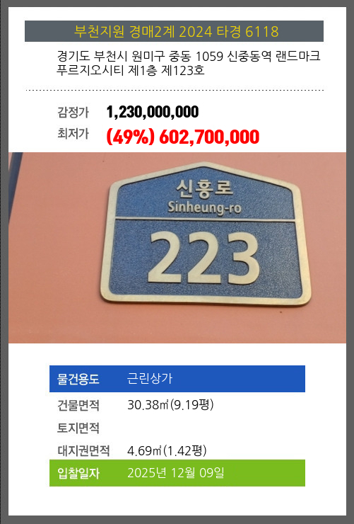 사건번호 2024 타경 6118 본건은 경기도 부천시 원미구 중동 1059 신중동역 랜드마크 푸르지오시티 제1층 제123호소재하는 근린상가경매 물건의 포스팅입니다. 건물면적 [ 30.38㎡ (9.19평) ]대지권 [ 4.69㎡