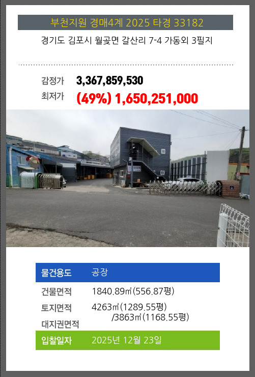 사건번호 2025 타경 33182 본건은 경기도 김포시 월곶면 갈산리 7-4 가동외 3필지소재하는 공장경매 물건의 포스팅입니다. 건물면적 [ 1840.89㎡ (556.87평) ]토지면적 [ 전체:4263㎡ (1289.55평) 매각지분:3863㎡ (1168.55평)