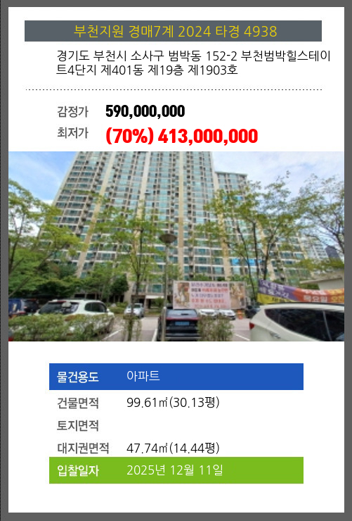 사건번호 2024 타경 4938 본건은 경기도 부천시 소사구 범박동 152-2 부천범박힐스테이트4단지 제401동 제19층 제1903호소재하는 아파트경매 물건의 포스팅입니다. 건물면적 [ 99.61㎡ (30.13평) ]대지권 [ 47.74㎡ (14.44평)