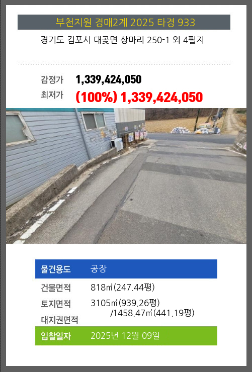 사건번호 2025 타경 933 본건은 경기도 김포시 대곶면 상마리 250-1 외 4필지소재하는 공장경매 물건의 포스팅입니다. 건물면적 [ 818㎡ (247.44평) ]토지면적 [ 전체:3105㎡ (939.26평) 매각지분:1458.47㎡ (441.19평)
