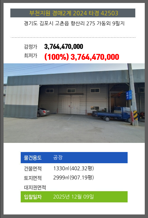 사건번호 2024 타경 42503 본건은 경기도 김포시 고촌읍 향산리 275 가동외 9필지소재하는 공장경매 물건의 포스팅입니다. 건물면적 [ 1330㎡ (402.32평) ]토지면적 [ 2999㎡ (907.19평) ] 시세를