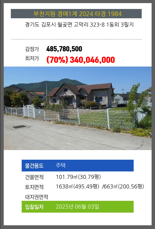 사건번호 2024 타경 1984 본건은 경기도 김포시 월곶면 고막리 323-8 1동외 3필지소재하는 주택경매 물건의 포스팅입니다. 건물면적 [ 101.79㎡ (30.79평) ]토지면적 [ 전체:1638㎡ (495.49평) 매각지분:663㎡ (200.56평)