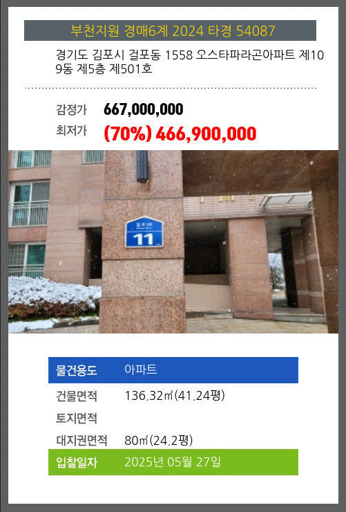 사건번호 2024 타경 54087 본건은 경기도 김포시 걸포동 1558 오스타파라곤아파트 제109동 제5층 제501호소재하는 아파트경매 물건의 포스팅입니다. 건물면적 [ 136.32㎡ (41.24평) ]대지권 [ 80㎡ (24.2평) ]