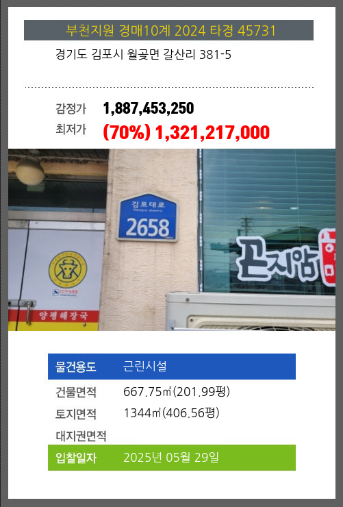 사건번호 2024 타경 45731 본건은 경기도 김포시 월곶면 갈산리 381-5소재하는 근린시설경매 물건의 포스팅입니다. 건물면적 [ 667.75㎡ (201.99평) ]토지면적 [ 1344㎡ (406.56평) ] 시세를 반영한 감정가