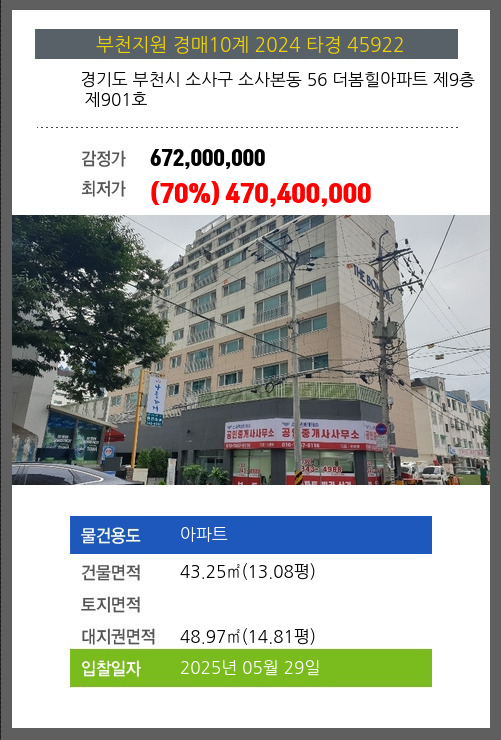 사건번호 2024 타경 45922 본건은 경기도 부천시 소사구 소사본동 56 더봄힐아파트 제9층 제901호소재하는 아파트경매 물건의 포스팅입니다. 건물면적 [ 43.25㎡ (13.08평) ]대지권 [ 48.97㎡ (14.81평) ]