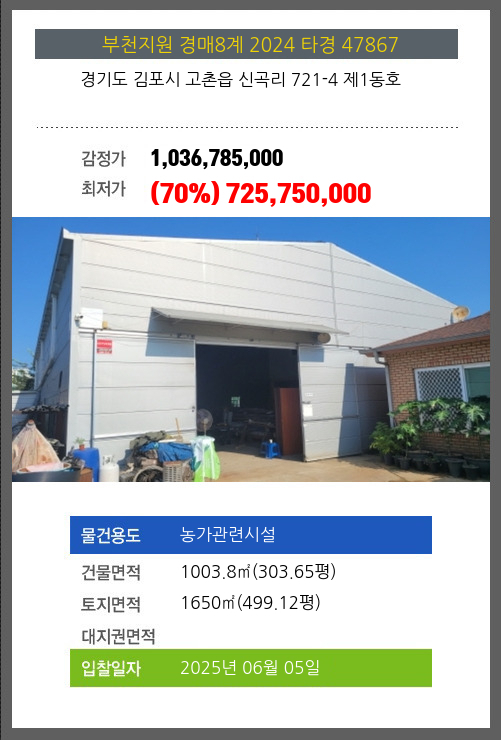 사건번호 2024 타경 47867 본건은 경기도 김포시 고촌읍 신곡리 721-4 제1동호소재하는 농가관련시설경매 물건의 포스팅입니다. 건물면적 [ 1003.8㎡ (303.65평) ]토지면적 [ 1650㎡ (499.12평) ] 시세를 반영한