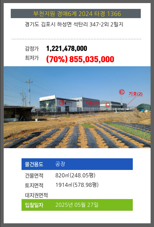 사건번호 2024 타경 1366 본건은 경기도 김포시 하성면 석탄리 347-2외 2필지소재하는 공장경매 물건의 포스팅입니다. 건물면적 [ 820㎡ (248.05평) ]토지면적 [ 1914㎡ (578.98평) ] 시세를 반영한