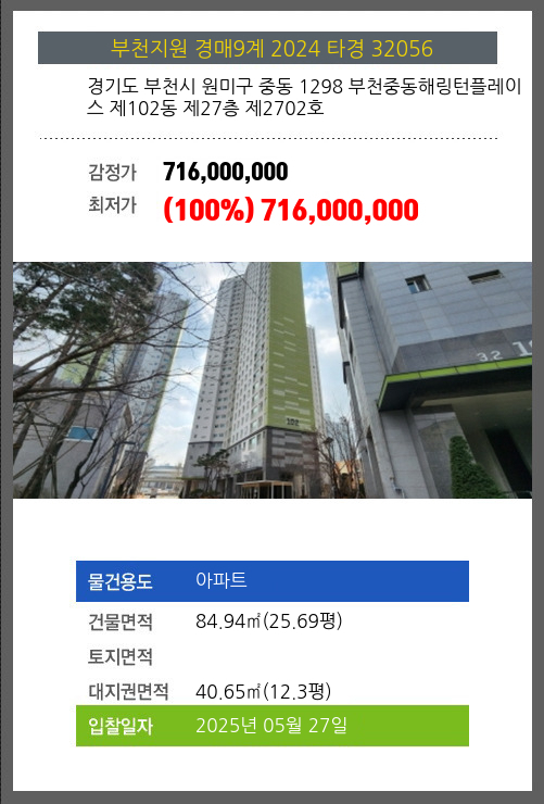 사건번호 2024 타경 32056 본건은 경기도 부천시 원미구 중동 1298 부천중동해링턴플레이스 제102동 제27층 제2702호소재하는 아파트경매 물건의 포스팅입니다. 건물면적 [ 84.94㎡ (25.69평) ]대지권 [ 40.65㎡ (12.3평)