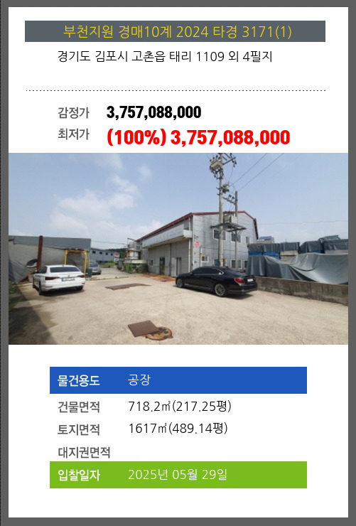 사건번호 2024 타경 3171(1) 본건은 경기도 김포시 고촌읍 태리 1109 외 4필지소재하는 공장경매 물건의 포스팅입니다. 건물면적 [ 718.2㎡ (217.25평) ]토지면적 [ 1617㎡ (489.14평) ] 시세를