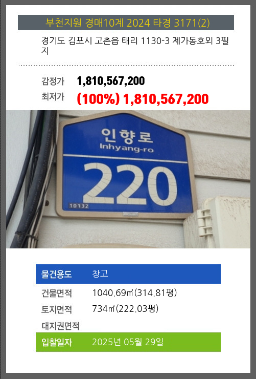 사건번호 2024 타경 3171(2) 본건은 경기도 김포시 고촌읍 태리 1130-3 제가동호외 3필지소재하는 창고경매 물건의 포스팅입니다. 건물면적 [ 1040.69㎡ (314.81평) ]토지면적 [ 734㎡ (222.03평) ] 시세를