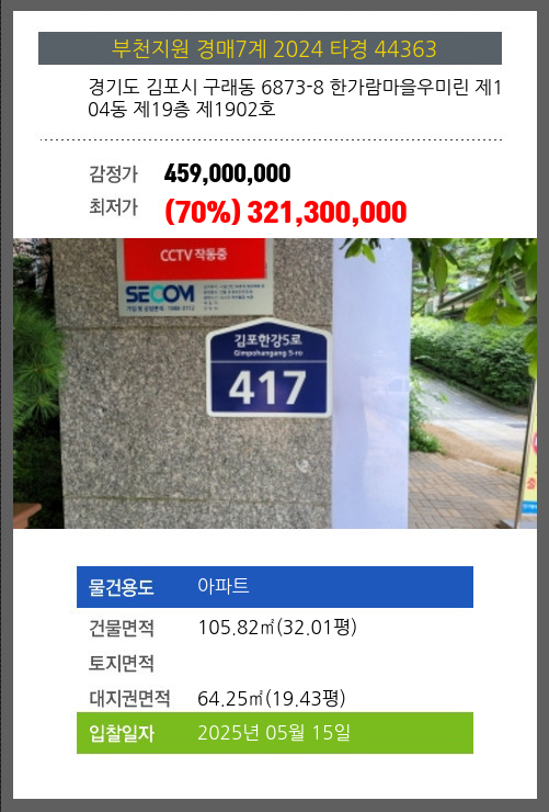 사건번호 2024 타경 44363 본건은 경기도 김포시 구래동 6873-8 한가람마을우미린 제104동 제19층 제1902호소재하는 아파트경매 물건의 포스팅입니다. 건물면적 [ 105.82㎡ (32.01평) ]대지권 [ 64.25㎡ (19.43평) ]