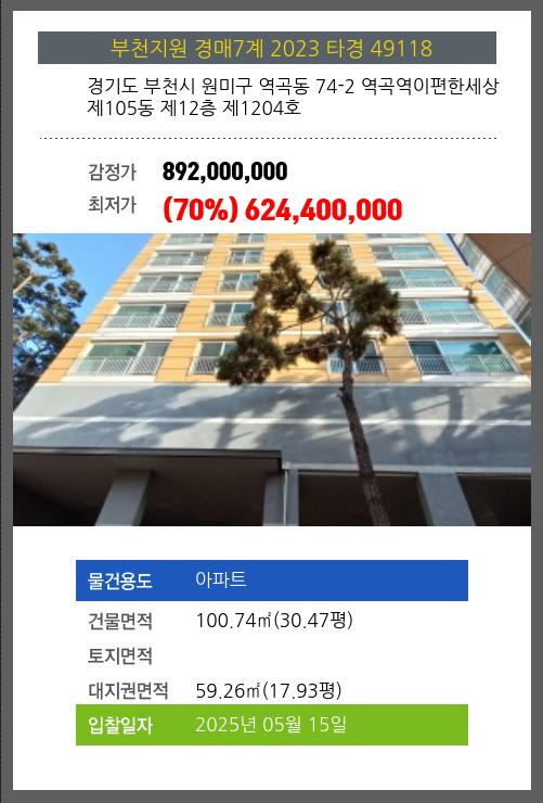 사건번호 2023 타경 49118 본건은 경기도 부천시 원미구 역곡동 74-2 역곡역이편한세상 제105동 제12층 제1204호소재하는 아파트경매 물건의 포스팅입니다. 건물면적 [ 100.74㎡ (30.47평) ]대지권 [ 59.26㎡ (17.93평)