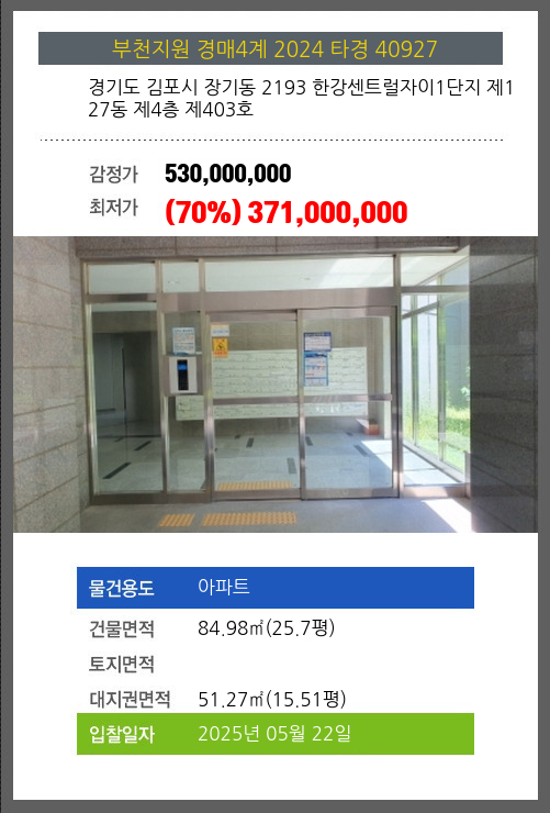 사건번호 2024 타경 40927 본건은 경기도 김포시 장기동 2193 한강센트럴자이1단지 제127동 제4층 제403호소재하는 아파트경매 물건의 포스팅입니다. 건물면적 [ 84.98㎡ (25.7평) ]대지권 [ 51.27㎡ (15.51평) ]