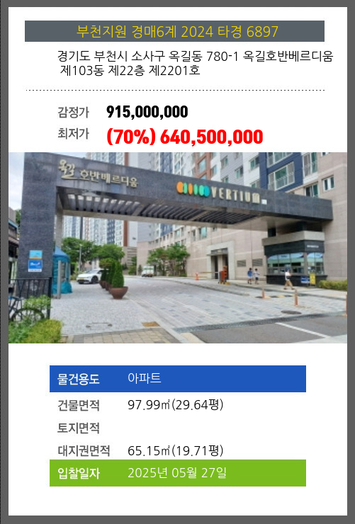 사건번호 2024 타경 6897 본건은 경기도 부천시 소사구 옥길동 780-1 옥길호반베르디움 제103동 제22층 제2201호소재하는 아파트경매 물건의 포스팅입니다. 건물면적 [ 97.99㎡ (29.64평) ]대지권 [ 65.15㎡ (19.71평)