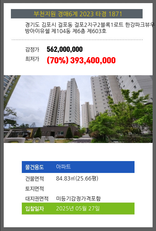 사건번호 2023 타경 1871 본건은 경기도 김포시 걸포동 걸포2지구2블록1로트 한강파크뷰우방아이유쉘 제104동 제6층 제603호소재하는 아파트경매 물건의 포스팅입니다. 건물면적 [ 84.83㎡ (25.66평) ]대지권 [ 미등기감정가격포함 ] 시세를