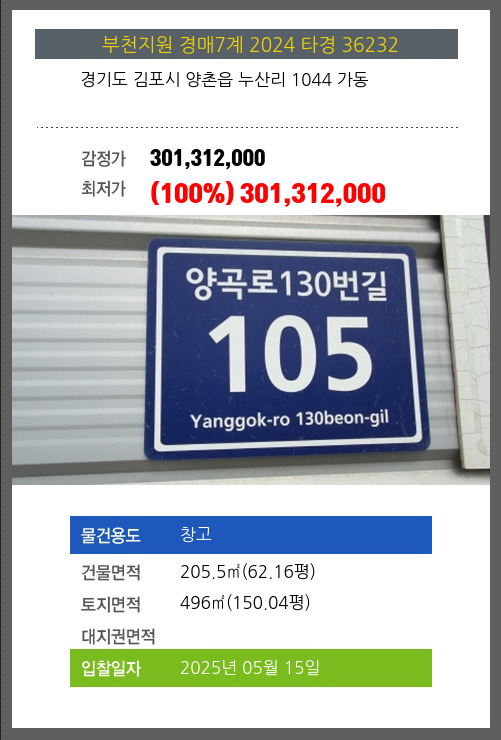 사건번호 2024 타경 36232 본건은 경기도 김포시 양촌읍 누산리 1044 가동소재하는 창고경매 물건의 포스팅입니다. 건물면적 [ 205.5㎡ (62.16평) ]토지면적 [ 496㎡ (150.04평) ] 시세를 반영한