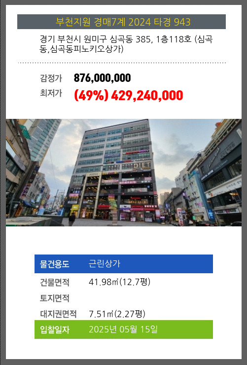 사건번호 2024 타경 943 본건은 경기 부천시 원미구 심곡동 385, 1층118호 (심곡동,심곡동피노키오상가)소재하는 근린상가경매 물건의 포스팅입니다. 건물면적 [ 41.98㎡ (12.7평) ]대지권 [ 7.51㎡ (2.27평) ] 시세를