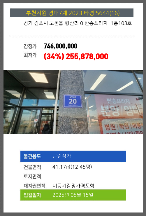 사건번호 2023 타경 5644(16) 본건은 경기 김포시 고촌읍 향산리 0 반송프라자 1층103호소재하는 근린상가경매 물건의 포스팅입니다. 건물면적 [ 41.17㎡ (12.45평) ]대지권 [ 미등기감정가격포함 ] 시세를 반영한