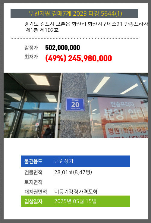 사건번호 2023 타경 5644(4) 본건은 경기 김포시 고촌읍 향산리 0 반송프라자 2층202호소재하는 근린상가경매 물건의 포스팅입니다. 건물면적 [ 94.85㎡ (28.69평) ]대지권 [ 미등기감정가격포함 ] 시세를 반영한