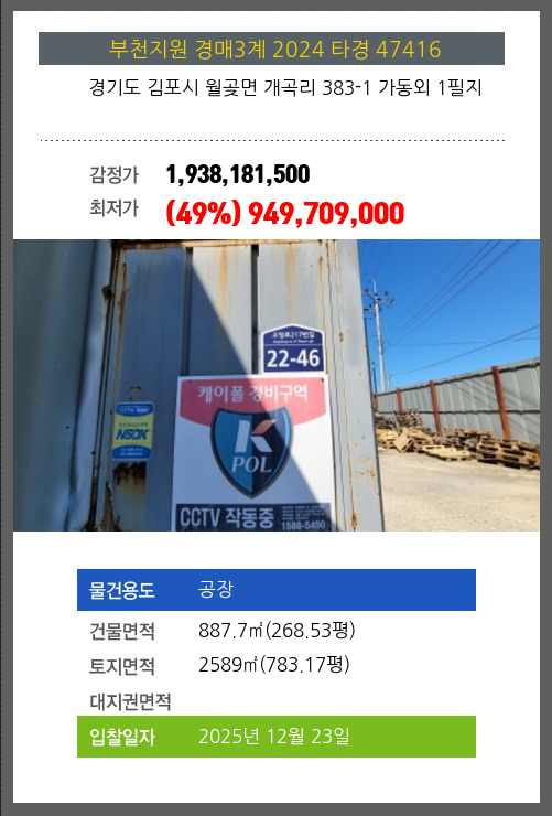 사건번호 2024 타경 47416 본건은 경기도 김포시 월곶면 개곡리 383-1 가동외 1필지소재하는 공장경매 물건의 포스팅입니다. 건물면적 [ 887.7㎡ (268.53평) ]토지면적 [ 2589㎡ (783.17평) ] 시세를