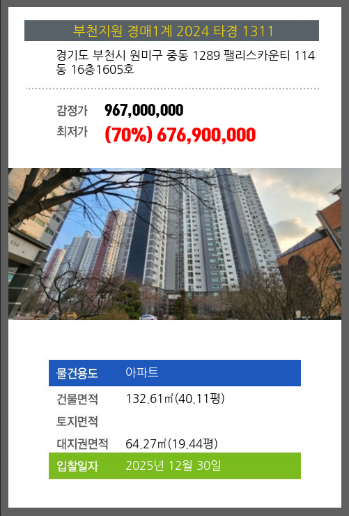 사건번호 2024 타경 1311 본건은 경기도 부천시 원미구 중동 1289 팰리스카운티 114동 16층1605호소재하는 아파트경매 물건의 포스팅입니다. 건물면적 [ 132.61㎡ (40.11평) ]대지권 [ 64.27㎡ (19.44평) ]