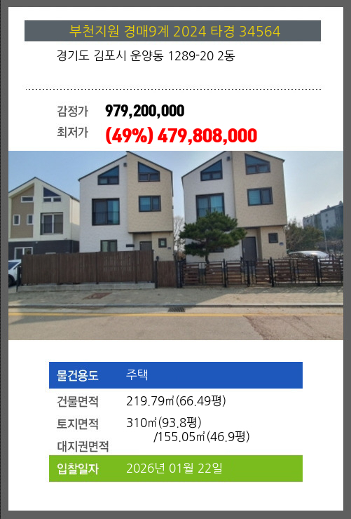 사건번호 2024 타경 34564 본건은 경기도 김포시 운양동 1289-20 2동소재하는 주택경매 물건의 포스팅입니다. 건물면적 [ 219.79㎡ (66.49평) ]토지면적 [ 전체:310㎡ (93.8평) 매각지분:155.05㎡ (46.9평) ] 시세를